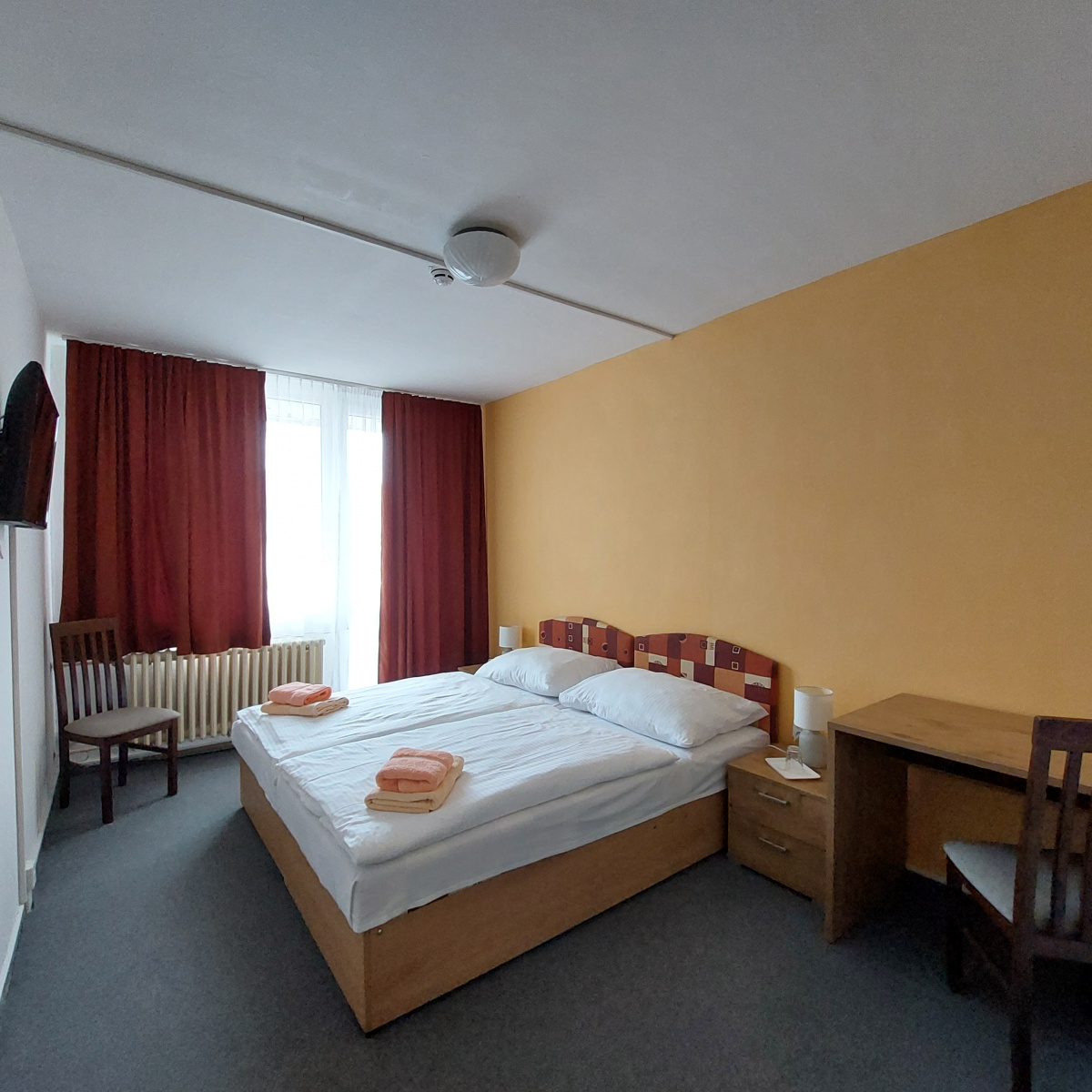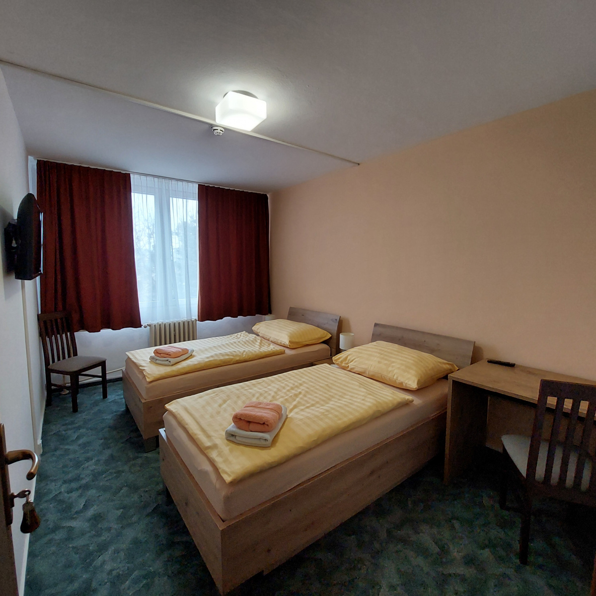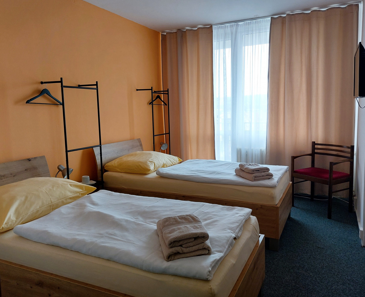 Dvojlôžková izba je súčasťou ubytovacej bunky. Rozmer samostatnej izby je 12m2, nájdete v nej pohodlné a čisté postele. Na požiadanie Vám zabezpečíme izbu s manželskou posteľou, avšak prevahu majú izby s dvoma oddelenými lôžkami. Izba ďalej zahŕňa LCD televízor, písaci stôl s dvoma stoličkami a dva nočné stolíky.
